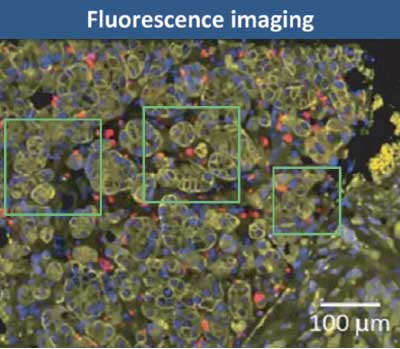 - Cellular structure is sharply defined by yellow pan-cytokeratin stain