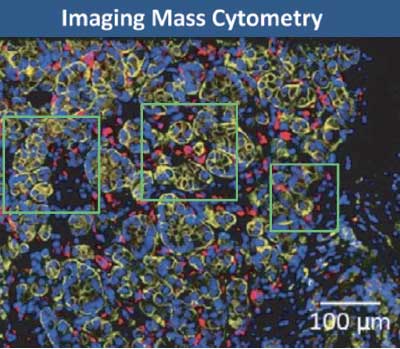 Imaging Mass Cytometry technology generates high-dimensional spatial data at subcellular resolution. IMC technology uses cytometry by time-of-flight (on which CyTOF™ systems are based) to overcome the multiplexing limitations of traditional immunohistochemistry (IHC) and immunofluorescence. By applying metal-tagged antibodies instead of fluorochromes, IMC technology has the unique capability to simultaneously stain, acquire and analyze 40-plus markers of interest on a tissue section without interference from autofluorescent tissues or management of spectral overlap.
