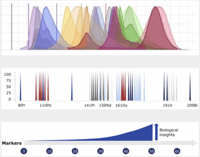 Mass cytometry is particularly advantageous because of its ability to precisely and accurately distinguish between reporter molecules. By using atomic mass measurements, mass cytometry avoids autofluorescence signals from cells and tissues, enables fast panel design since all antibodies are used at once and facilitates barcoding to multiplex samples in large-scale acquisitions.